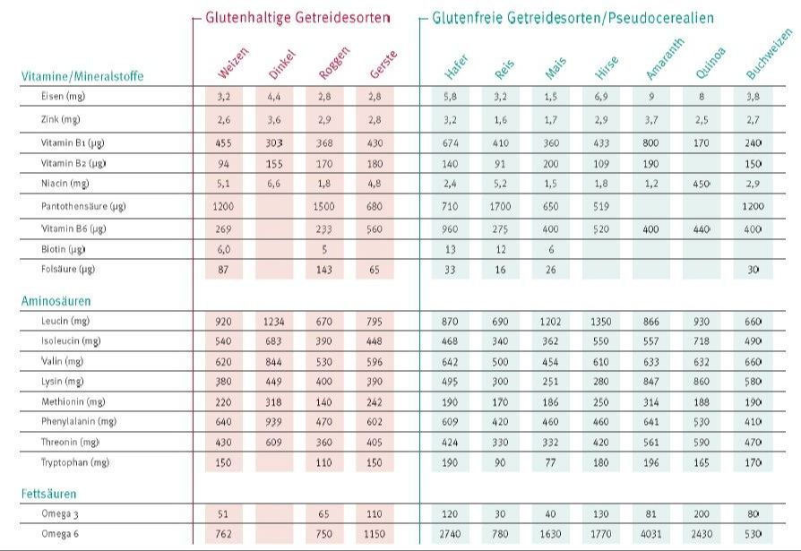 Nutritional comparison of gluten-containing and gluten-free cereals and pseudocereals.