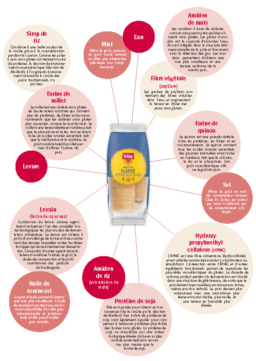 Bien évidemment, les avantages structurels et sensoriels du gluten ne peuvent pas être remplacés par un seul ingrédient. Pour obtenir un produit dont le goût et la structure sont optimaux et qui répond en plus aux exigences nutritionnelles, il faut sélectionner un mélange équilibré d'ingrédients de haute qualité nutritionnelle. L'étiquette de notre produit le plus vendu Maestro Classic, reproduite ci-après, doit aider à décrypter la liste d'ingrédients des aliments sans gluten. Nous expliquons la fonctionnalité de chaque ingrédient et la manière dont ils contribuent à la consistance de la mie et de la croûte ainsi qu'au goût et à la qualité de ce produit.